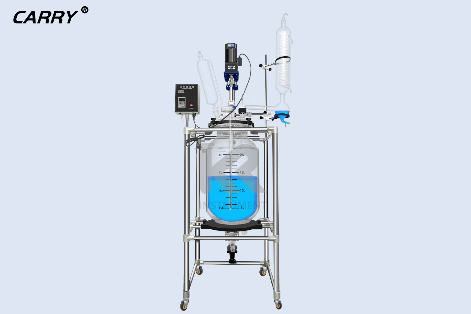 50L雙層玻璃反應(yīng)釜具有電動(dòng)恒速攪拌系統(tǒng)、冷凝、滴加系統(tǒng),釜體夾層需外接...